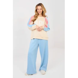 Moderní dámský dresový set skládající se z mikiny a kalhot, udržovaný v casual stylu, ideální na každý den. Skvěle poslouží při každodenních aktivitách, procházkách nebo relaxaci doma. Vyrobený z vysoce kvalitní směsi polyesteru, viskózy a elastanu, která poskytuje pohodlí, pružnost a dobře padne k postavě. Mikina s dlouhým rukávem a klasickým, kulatým výstřihem byla ozdobena nápisem vpředu, dodávajícím celku moderní charakter. Kalhoty s dlouhými, širokými nohavicemi a vysokým pasem zaručují pohodlí nošení, a boční kapsy zvyšují funkčnost. Proužky na rukávech mikiny jsou stylovým doplňkem podtrhujícím sportovně-městský vzhled.