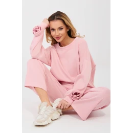 Elegantní dámský set skládající se z mikiny a kalhot, ideální pro každodenní outfit v casual stylu. Vyrobený z měkké a příjemné viskózy s přídavkem elastanu, který zajistí pohodlí a volnost pohybu po celý den. Mikina s dlouhými rukávy má kulatý výstřih a je zdobená jemnou látkovou růží na zápěstí, která dodává celku ženský a originální charakter. Kalhoty s vysokým pasem a přímými nohavicemi zaručují pohodlí a nadčasový vzhled. V pasu mají vsazenou gumu a šňůrky na stažení, které umožní ideální přizpůsobení siluetě. Další výhodou jsou boční kapsy, které zvyšují funkčnost setu. Hladký vzor činí set univerzálním a snadno kombinovatelným, skvělý jak na procházku, tak i na běžné nošení. Toto je nabídka pro ženy, které oceňují pohodlí, styl a jemné detaily.