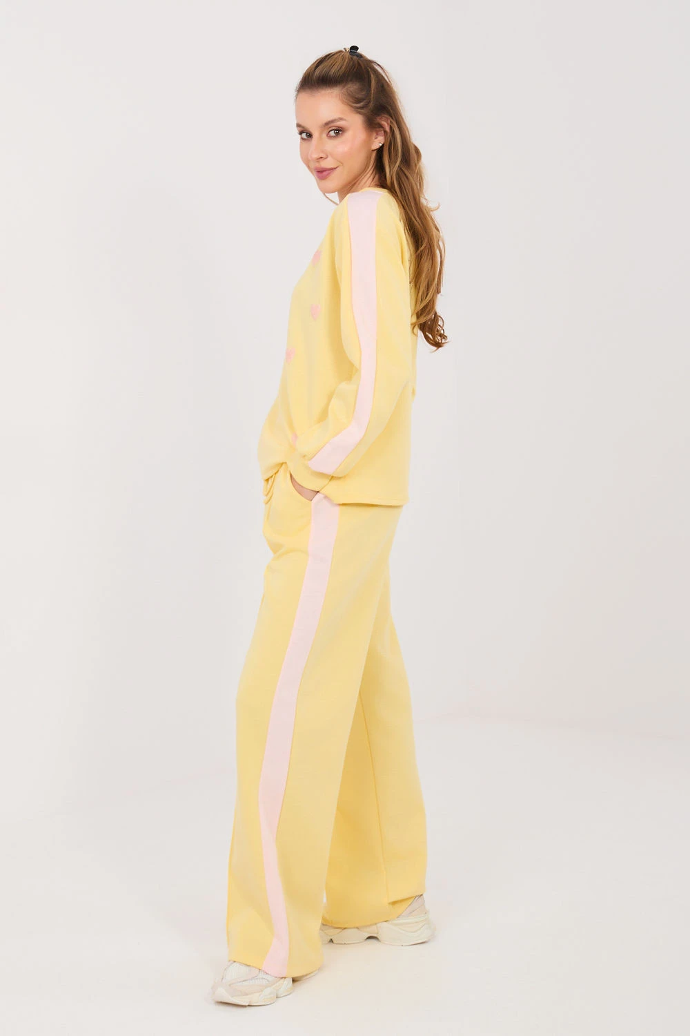Tento dámský teplákový set skládající se z mikiny a kalhot je ideální nabídkou pro každodenní nošení pro ženy, které ocení pohodlí, volnost pohybu a módní, ležérní styl. Měkký materiál typu froté je neuvěřitelně jemný a příjemný na dotek, díky čemuž se set skvěle hodí jak pro domácí odpočinek, tak i pro každodenní vycházky. Mikina s dlouhým rukávem s pruhem byla ozdobena decentním motivem srdíček na přední straně, což dodává celku ženský a dívčí charakter. Široké nohavice kalhot s módními pruhy opticky zúžují postavu, a vysoký pas krásně zdůrazňuje pas a zajišťuje pohodlné nošení. Nastavitelný pas s šňůrkami umožňuje ideální přizpůsobení, a boční kapsy zvyšují funkčnost setu. Jedná se o teplákový set, který spojuje pohodlí s módním vzhledem. Ideální na procházky, nákupy, cestování nebo lenivé dny doma vždy, když chcete být pohodlně a stylově zároveň.