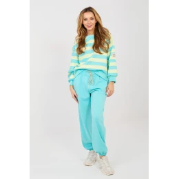Elegantní set s teplákovou soupravou v casualovém provedení je ideální nabídkou na každý den. Kombinace pohodlí a módních detailů dělá tento set skvělým pro každodenní aktivity, procházky nebo relaxaci. Mikina s dlouhým rukávem a kulatým výstřihem se vyznačuje pruhy na materiálu, které jí dodávají moderní charakter. Dalším akcentem je decentní nášivka na levém rukávu, zdůrazňující stylový vzhled modelu. Kalhoty s vysokým pasem a dlouhými nohavicemi zakončenými stahovacími pásky se skvěle přizpůsobují siluetě. V pase je elastický pásek a šňůrky na stahování, které umožňují individuální přizpůsobení. Boční kapsy zvyšují funkčnost celého setu. Celý set je vyroben z mimořádně měkkého materiálu typu máslo z směsi viskózy, bavlny a elastanu. Tkanina je jemná, elastická a neuvěřitelně příjemná na dotek, poskytující maximální pohodlí po celý den.