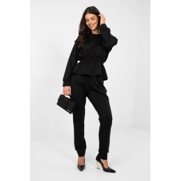 Elegantní dámský set skládající se z mikiny a kalhot, ideální na každodenní nošení a do práce v méně formálním provedení. Kombinovaný charakter setu spojuje pohodlí s moderním, minimalistickým designem. Model vyrobený z vysoké kvality směsi polyesteru, viskózy a elastanu, díky čemuž je materiál měkký, elastický a příjemný na nošení. Hladká tkanina zdůrazňuje univerzální styl setu a usnadňuje vytváření různorodých stylizací. Mikina s dlouhým rukávem a klasickým, kulatým výstřihem poskytuje pohodlí a nadčasový vzhled. Vykrojení v pasu jí dodává lehkost a decentně zdůrazňuje postavu. Kalhoty s vysokým pasem a elastickým pásem zaručují pohodlné přizpůsobení. Dlouhé nohavice s lemováním na suchý zip dodávají sportovní nádech, a boční kapsy zvyšují funkčnost. Jedná se o praktický a stylový set, který se osvědčí jak při každodenních povinnostech, tak v práci, zajišťujíc pohodlí po celý den. Materiál typu "máslo" je měkký, jemný a mimořádně příjemný na dotek.