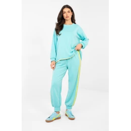 Stylová souprava se skládá z mikiny a kalhot a je ideální nabídkou na každodenní nošení pro ty, kteří ocení pohodlí v módním provedení. Vyrobená z vysoké kvality směsi polyesteru, viskózy a elastanu, materiál je měkký, elastický a příjemný na dotek, poskytující pohodlí po celý den. Mikina s klasickým, kulatým výstřihem a dlouhým rukávem skvěle zapadá do ležérního stylu. Hladký vzor dodává celku univerzální charakter, díky čemuž je soupravu snadné sladit s různými doplňky. Kalhoty s vysokým pasem mají praktické šňůrky v pasu, které umožňují individuální nastavení. Model s dlouhými nohavicemi zakončenými manžetami poskytuje pohodlí a sportovní vzhled. Boční kapsy zvyšují funkčnost, a moderní pruhy po stranách nohavic dodávají celku dynamický a moderní akcent. Jedná se o skvělý výběr na každodenní vycházky, procházky nebo relaxaci v domácím útulku spojení pohodlí a stylu v jednom setu.
