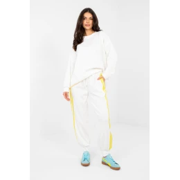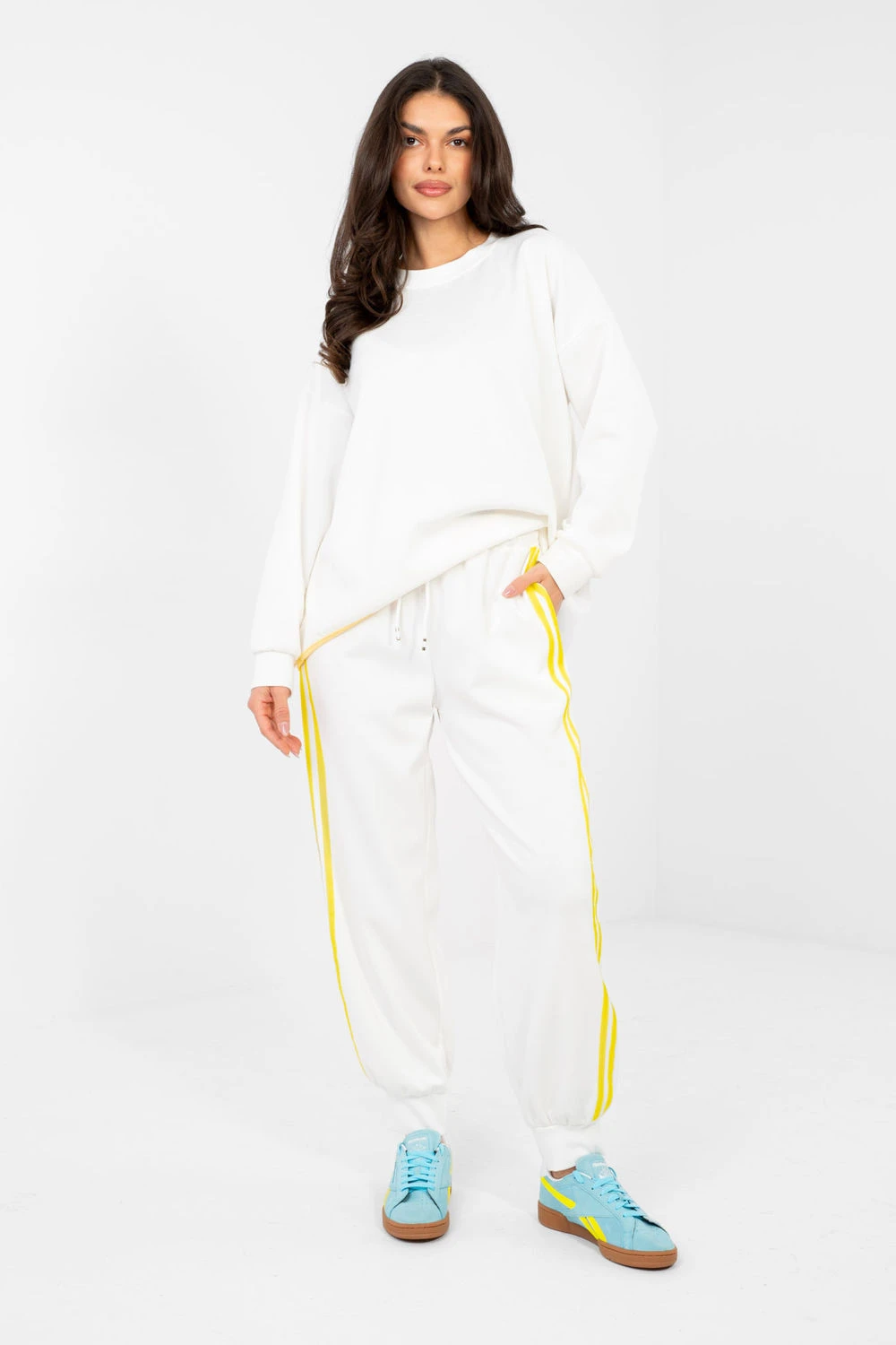 Stylová dvojice tepláků skládající se z mikiny a kalhot je ideální nabídkou pro každodenní nošení pro ty, kteří ocení pohodlí v módním provedení. Vyrobený z vysoké kvality směsi polyesteru, viskózy a elastanu, materiál je měkký, elastický a příjemný na dotek, poskytující pohodlí po celý den. Mikina s klasickým, kulatým výstřihem a dlouhým rukávem skvěle zapadá do casual stylu. Hladký vzor dodává celku univerzální charakter, díky čemuž je dvojici snadné sladit s různými doplňky. Kalhoty s vysokým pasem mají v pase praktické šňůrky, které umožňují individuální nastavení. Model s dlouhými nohavicemi zakončenými lemováním zajišťuje pohodlí a sportovní vzhled. Boční kapsy zvyšují funkčnost, a moderní pruhy po stranách nohavic dodávají celku dynamický a moderní nádech. Je to skvělá volba na každodenní vycházky, procházky nebo odpočinek v domácím útulku spojení pohodlí a stylu v jednom setu.