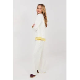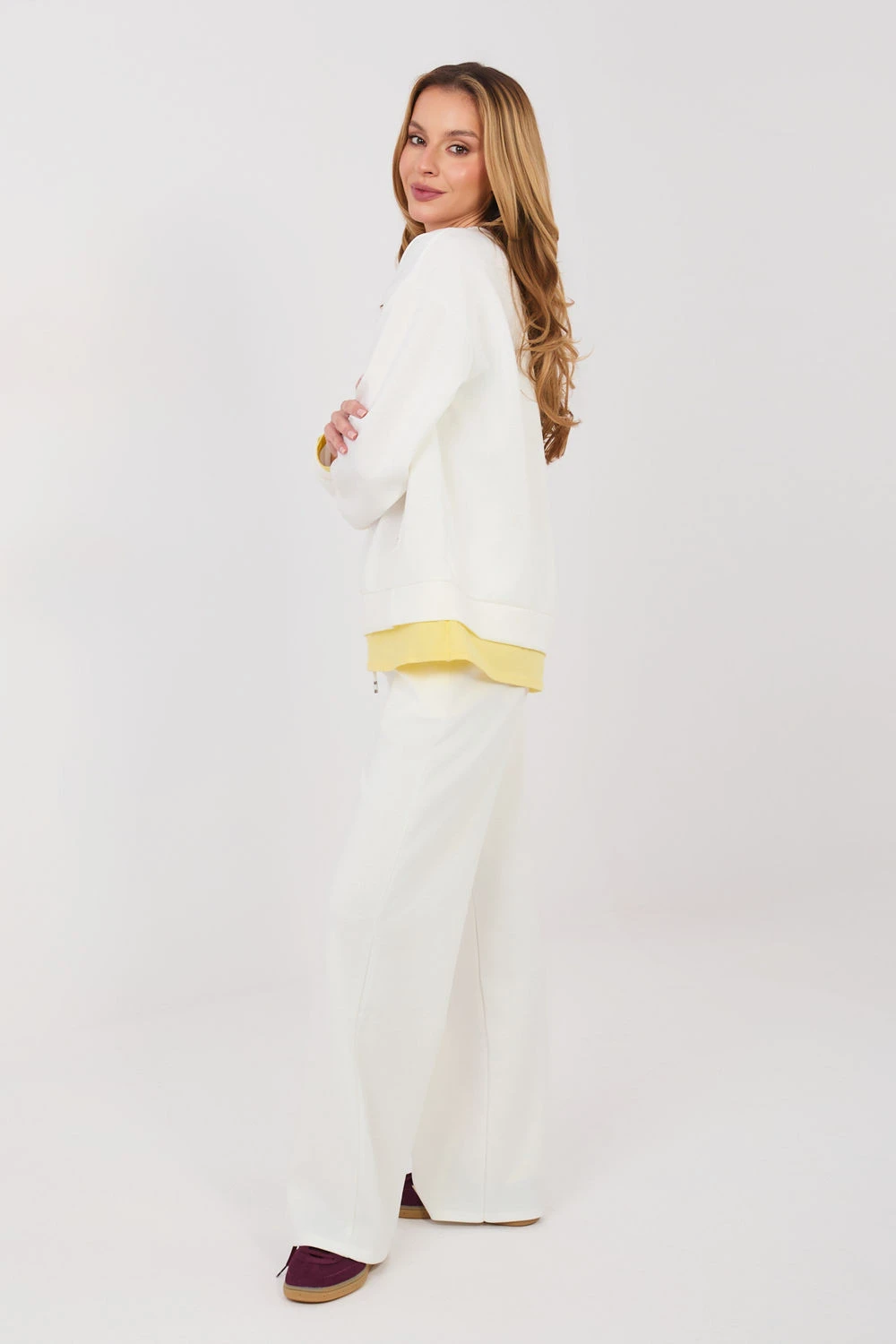 Sada oblečení v casual stylu je skvělou volbou pro ženy, které ocení pohodlí a moderní minimalismus. Hladký vzor zdůrazňuje univerzální charakter setu, díky čemuž se skvěle hodí jak na každodenní vycházky, tak i do domácího útulku. Vyrobený z vysoce kvalitní směsi polyesteru, viskózy a elastanu, set poskytuje pohodlí, pružnost a příjemné přizpůsobení se postavě. Materiál je měkký, odolný a odolný proti mačkání, což zajišťuje, že set si udrží estetický vzhled po dlouhou dobu. Mikina s dlouhým rukávem je zdobena kontrastními vložkami, které dodávají celku módní charakter. Dalším akcentem je nášivka umístěná vpředu, vlevo dole, zdůrazňující moderní styl setu. Kalhoty s dlouhou délkou a přímými nohavicemi a vysokým pasem krásně tvarují postavu a zajišťují pohodlí nošení. V pase jsou šňůrky ke stažení, umožňující ideální přizpůsobení, a boční kapsy zvyšují funkčnost setu. Jedná se o stylový a praktický set, který spojuje pohodlí s nadčasovou jednoduchostí.