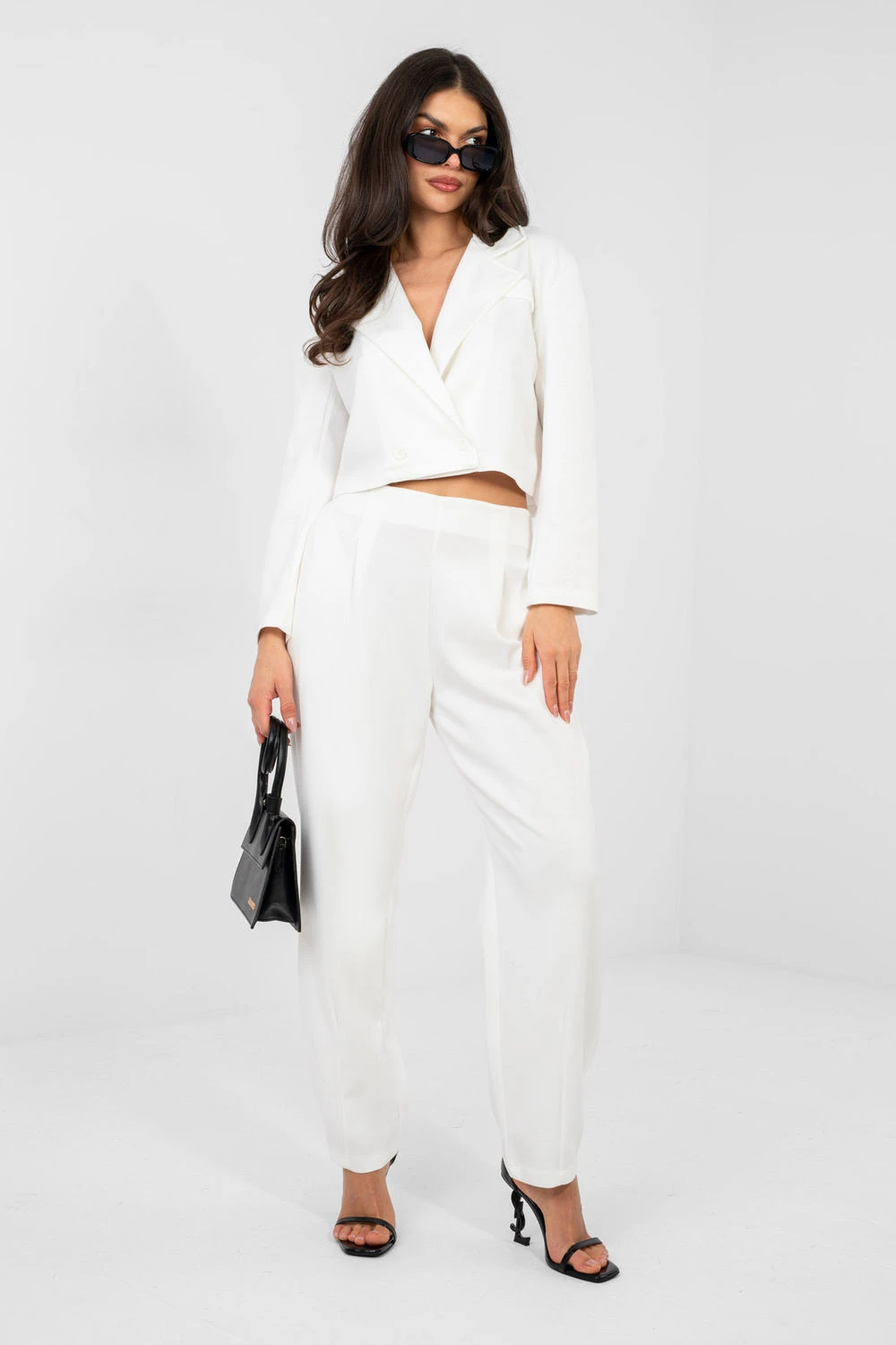 Elegantní dámský komplet skládající se z krátkého saka a dlouhých kalhot je skvělým návrhem do práce i na každý den. Klasický, hladký vzor zdůrazňuje nadčasový charakter setu a pečlivě vybraná tkanina (polyester, viskóza, elastan) zaručuje pohodlí, trvanlivost a estetický vzhled po celý den. Krátké sako s dlouhým rukávem je zdobeno límečky, které mu dodávají eleganci a profesionální vzhled. Dvojřadé zapínání na knoflíky přidává eleganci a jemně tvaruje postavu. Kalhoty s vysokým pasem krásně zdůrazňují pas a zužující se nohavice zjemňují nohy. Model bez klasického zapínání, s elastickým pásem vzadu, zaručuje pohodlí nošení a ideální přizpůsobení. Další výhodou jsou praktické boční kapsy. Materiál typu "máslo" je měkký, jemný a mimořádně příjemný na dotek.