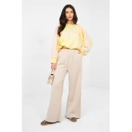 Elegantní set tepláků v casualovém provedení je ideální nabídkou na každý den. Pohodlná a zároveň módní sestava se skládá z mikiny s dlouhým rukávem a dlouhých kalhot s širokým nohavicemi, vytvářející pohodlný a moderní stylizaci. Mikina s kulatým výstřihem byla ozdobena efektním nápisem na přední straně, který dodává celku charakter. Další výhodou jsou ozdobné pruhy na rukávech, zdůrazňující sportovní, dynamický styl modelu. Kalhoty s vysokým pasem krásně modelují postavu a zajišťují pohodlí nošení. V pasu je vsazena elastická guma, díky čemuž kalhoty skvěle sedí na pasu. Široké nohavice dodávají celku volný, moderní vzhled, a boční kapsy zvyšují funkčnost sestavy. Set je vyroben z příjemné směsi polyesteru, viskózy a elastanu, materiál je měkký, elastický a odolný proti zmačkání, což znamená, že se skvěle osvědčí v každodenním používání. Ideální volba pro ženy, které oceňují pohodlí, volnost a módní vzhled v každodenních stylizacích.