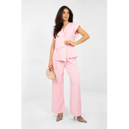 Stylový dámský set spojující eleganci s moderním střihem. Sada se skládá z vesty s krátkým rukávem a dlouhých kalhot s širokou nohavicí, vytvářející souvislý a efektní outfit ideální do práce, na každý den i na slavnostní události. Vesta s přesýpacím výstřihem krásně zdůrazňuje linii krku a opticky ztencuje postavu. Model je zapínán na knoflík a v pasu má šňůrku tenkým páskem, která umožňuje individuální přizpůsobení a zdůraznění ženských tvarů. Hladký vzor dodává celku nadčasový charakter. Kalhoty s vysokým pasem dokonale modelují postavu, zajistí pohodlí a elegantní vzhled. V pasu vsazená elastická guma zaručuje pohodlné nošení a ideální přizpůsobení. Široké, dlouhé nohavice přidávají outfitu lehkost a eleganci, a praktické boční kapsy zvyšují funkčnost. Set je vyroben z vysoce kvalitní směsi polyesteru a viskózy, materiál je příjemný na dotek, lehce elastický a dobře se přizpůsobuje postavě. Jedná se o ideální nabídku pro ženy, které ocení eleganci, pohodlí a všestrannost v jednom outfitu.