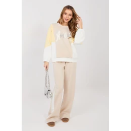 Mimořádně pohodlná dámská tepláková sada vyrobena z materiálu typu "flísek" je neuvěřitelně měkká, jemná a příjemná na dotek. Tkanina složená z polyesteru, viskózy a elastanu je elastická, lehce se vlní a skvěle padne na postavu, poskytujíc maximální pohodlí při každodenním nošení. Sada se skládá z mikiny s dlouhým rukávem a kalhot s širokými, dlouhými nohavicemi. Mikina s klasickým, kulatým výstřihem je zdobená efektním nápisem s flitry, který dává celku módní a ženský charakter. Kalhoty s vysokým pasem krásně zdůrazňují pas a zajišťují pohodlné nošení. V pasu jsou šňůrky ke stažení, umožňující ideální přizpůsobení postavě. Praktické boční kapsy zvyšují funkčnost a široké nohavice dodávají outfitu volný, moderní vzhled. Jedná se o ideální sadu pro ženy, které oceňují kombinaci mimořádné měkkosti, pohodlí a módních detailů v každodenních stylizacích.