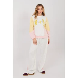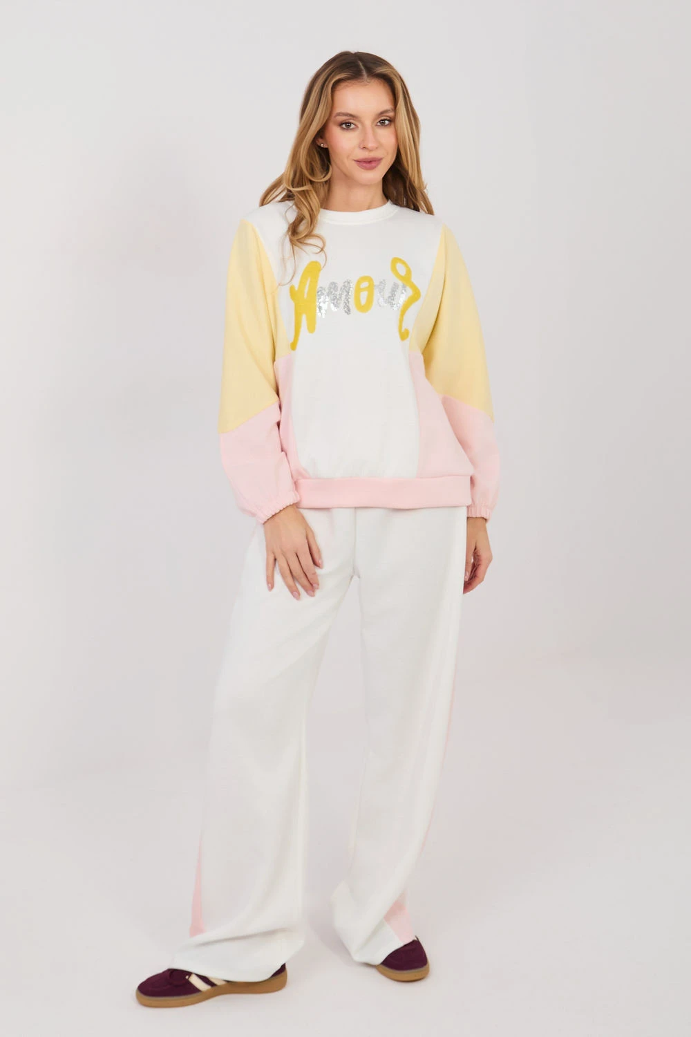 Mimořádně pohodlný dámský teplákový set vyrobený z materiálu typu jemné máslo, který je neuvěřitelně měkký, jemný a příjemný na dotek. Tkanina z polyesteru, viskózy a elastanu je elastická, lehce padající a dokonale se přizpůsobuje postavě, poskytující maximální pohodlí při každodenním nošení. Sada se skládá z mikiny s dlouhým rukávem a kalhot s širokými, dlouhými nohavicemi. Mikina s klasickým, kulatým výstřihem je zdobena efektním nápisem s flitry, který dodává celku módní a ženský charakter. Kalhoty s vysokým pasem krásně zdůrazňují pas a zajišťují pohodlné nošení. V pase jsou šňůrky na stahování, umožňující dokonalé přizpůsobení postavě. Praktické boční kapsy zvyšují funkcionalitu a široké nohavice dodávají stylingu volný, moderní vzhled. Jedná se o ideální set pro ženy, které si cení spojení mimořádné měkkosti, pohodlí a moderních detailů v každodenních stylizacích.