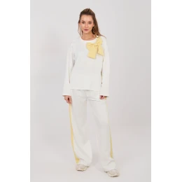 Stylový dámský teplákový komplet v casualovém provedení je ideální nabídkou na každý den. Kombinace pohodlí s módními detaily z něj činí skvělý set pro každodenní aktivity, procházky nebo setkání ve volném stylu. Komplet se skládá z mikiny s dlouhým rukávem a klasickým kulatým výstřihem a dlouhých kalhot s širokými nohavicemi. Hladký vzor zdůrazňuje univerzální charakter setu, díky čemuž se snadno sladí s různými doplňky. Mikina je zdobena efektním kontrastním mašlí na přední straně, což dodává celku ženský a decentní elegantní akcent. Kalhoty s vysokým pasem krásně modelují pas a elastický pás zaručuje pohodlné přizpůsobení postavě. Další výhodou jsou praktické boční kapsy a pruhy běžící podél nohavic, které dodávají sportovní charakter a opticky prodlužují nohy. Set je vyroben z příjemné směsi polyesteru, viskózy a elastanu, materiál je měkký, elastický a odolný proti vráskám, což zaručuje pohodlí nošení po celý den. Je to pohodlný a ženský set, který spojuje sportovní volnost s módními detaily.