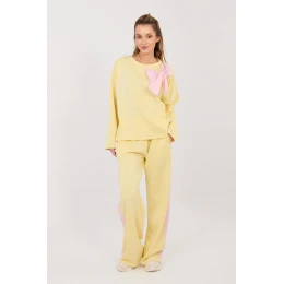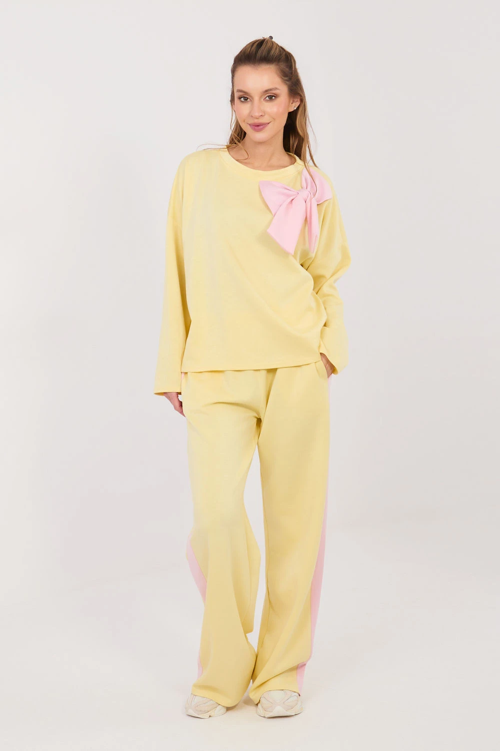 Elegantní dámský dresový set v casual stylu je ideální volbou na každý den. Kombinace pohodlí s módními detaily zajišťuje, že tento set skvěle poslouží během každodenních aktivit, procházek nebo setkání ve volném stylu. Set se skládá z mikiny s dlouhým rukávem a klasickým, kulatým výstřihem a dlouhých kalhot s širokými nohavicemi. Hladký vzor zdůrazňuje univerzální charakter setu, díky čemuž je snadné ho sladit s různými doplňky. Mikina je zdobena efektní kontrastní mašlí vpředu, která dodává celku ženský a jemně elegantní akcent. Kalhoty s vysokým pasem krásně tvarují pas, a elastický pásek v pasu zajistí pohodlné přizpůsobení postavě. Další výhodou jsou praktické boční kapsy a pruhy po stranách nohavic, které dodávají sportovní charakter a opticky prodlužují nohy. Set je vyroben z příjemné směsi polyesteru, viskózy a elastanu, materiál je měkký, elastický a odolný proti vráskám, což zaručuje pohodlné nošení po celý den. Jedná se o pohodlný a ženský set, který spojuje sportovní volnost s módními detaily.