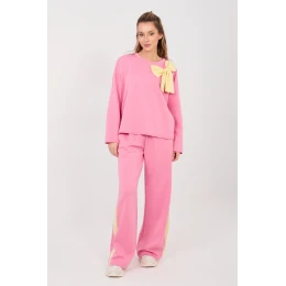 Stylový dámský teplákový set v casual stylu je ideální nabídkou na každý den. Kombinace pohodlí s módními detaily zaručuje, že tento set skvěle poslouží během každodenních aktivit, procházek nebo neformálních setkání. Set se skládá z mikiny s dlouhým rukávem a klasickým kulatým výstřihem a dlouhých kalhot s širokými nohavicemi. Hladký vzor zdůrazňuje univerzální charakter setu, díky čemuž je snadné ho sladit s různými doplňky. Mikina je ozdobena efektním kontrastním mašlí na přední straně, která dodává celku ženský a decentní elegantní akcent. Kalhoty s vysokým pasem krásně tvarují pas a elastická guma v pasu zaručuje pohodlné přizpůsobení se postavě. Další výhodou jsou praktické boční kapsy a pruhy podél nohavic, které dodávají sportovní charakter a opticky prodlužují nohy. Set je vyroben z příjemné směsi polyesteru, viskózy a elastanu, materiál je měkký, elastický a odolný proti vráskám, což zaručuje pohodlné nošení po celý den. Jedná se o pohodlný a ženský set, který spojuje sportovní volnost s módními detaily.