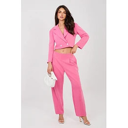 Elegantní dámský komplet skládající se z krátkého saka a dlouhých kalhot je skvělým návrhem do práce i na každý den. Klasický, hladký vzor zdůrazňuje nadčasový charakter sady a pečlivě vybraná tkanina (polyester, viskóza, elastan) zajišťuje pohodlí, odolnost a estetický vzhled po celý den. Krátké sako s dlouhým rukávem je dokončeno límečkem s klopy, které mu dodávají eleganci a profesionální charakter. Dvojitý řadový závěr na knoflíky přidává eleganci a jemně modeluje postavu. Kalhoty s vysokým pasem krásně zdůrazňují pas a zúžené nohavice zeštíhlují nohy. Model bez klasického zapínání, s elastickým pásem vpředu, zaručuje pohodlí nošení a dokonalé přizpůsobení. Další výhodou jsou praktické boční kapsy. Měkký, jemný a mimořádně příjemný na dotek materiál typu měkké máčko. Jedná se o univerzální komplet, který spojuje eleganci s pohodlím, ideální do kanceláře, na obchodní schůzky a stylové každodenní vycházky.