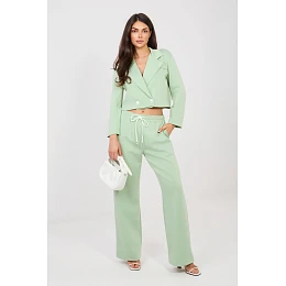 Elegantní dámský komplet skládající se z krátkého saka a dlouhých kalhot je skvělým návrhem do práce i na každý den. Klasický, hladký vzor podtrhuje nadčasový charakter setu a pečlivě vybraná tkanina (polyester, viskóza, elastan) zajišťuje pohodlí, odolnost a estetický vzhled po celý den. Krátké sako s dlouhým rukávem je zdobeno límci, které mu dodávají eleganci a profesionální charakter. Dvojitý řadový zapínací prvek na knoflíky přidává eleganci a jemně tvaruje postavu. Kalhoty s vysokým pasem krásně zdůrazňují pas a zužující se nohavice opticky zjemňují nohy. Model bez klasického zapínání s elastickým pásem na zádech zaručuje pohodlí nošení a ideální přizpůsobení. Další výhodou jsou praktické boční kapsy. Měkký, jemný a velmi příjemný na dotek materiál je univerzálním kompletem, který spojuje eleganci s pohodlím, ideální do kanceláře, na obchodní schůzky a stylové každodenní vycházky.