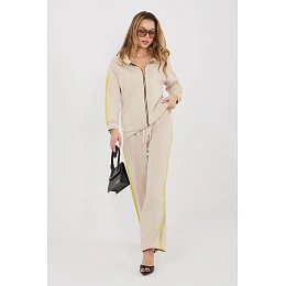 Dámský teplý set skládající se z mikiny a kalhot, ideální pro každodenní outfit v casual stylu. Hladký vzor dává setu moderní a univerzální vzhled, díky čemuž bude skvěle padnout na procházku, nákupy nebo relax. Set je vyroben z pohodlné směsi polyesteru, elastanu a viskózy, materiál je měkký, elastický a dobře se přizpůsobí postavě, poskytující pohodlí po celý den. Mikina s dlouhým rukávem má praktickou kapuci a zip, co usnadňuje oblékání a umožňuje ji přizpůsobit počasí. Další výhodou jsou boční kapsy. Rukávy jsou ozdobeny módními pruhy, které dodávají sportovní charakter. Kalhoty mají vysoký pas a dlouhé, široké nohavice, které zajistí volnost pohybu. V pase je elastický pásek a šňůrka pro lepší přizpůsobení. Pruhy na nohavicích zdůrazňují moderní, sportovně-casualový styl setu.