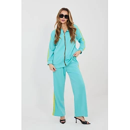 Dámský dvojset se skládá z mikiny a kalhot, ideální pro každodenní casual stylizace. Hladký vzor dělá kombinaci moderní a univerzální, takže je skvělá na procházky, nákupy nebo relaxaci. Dvojset je vyroben z pohodlné směsi polyesteru, elastanu a viskózy. Materiál je měkký, pružný a dobře sedí na postavě, poskytující pohodlí po celý den. Mikina s dlouhým rukávem má praktickou kapuci a zip, co usnadňuje oblékání a umožňuje ji přizpůsobit počasí. Další výhodou jsou boční kapsy. Rukávy jsou zdobeny módními pruhy, které dodávají sportovní charakter. Kalhoty mají vysoký pas a dlouhé, široké nohavice, které zajišťují volnost pohybu. V pase je elastický pásek a šňůrka pro lepší přizpůsobení. Pruhy na nohavicích zdůrazňují moderní, sportovně-casualový styl dvojsetu.