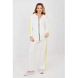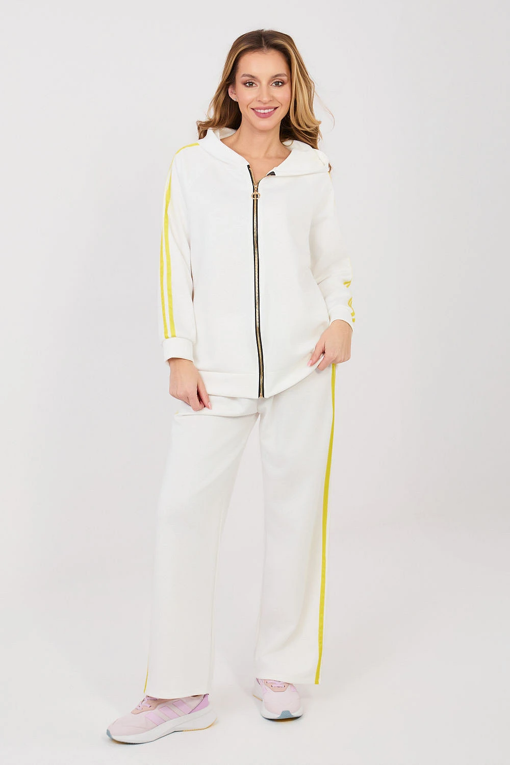 Dámská souprava se skládá z mikiny a kalhot, ideální pro každodenní outfit v casual stylu. Hladký vzor dělá soupravu moderní a univerzální, což z ní činí skvělý doplněk pro procházky, nákupy nebo relaxaci. Souprava je vyrobena z pohodlné směsi polyesteru, elastanu a viskózy, která je měkká, elastická a dobře se přizpůsobuje postavě, poskytující pohodlí po celý den. Mikina s dlouhým rukávem má praktickou kapuci a zip, co usnadňuje oblékání a umožňuje ji přizpůsobit podle počasí. Další výhodou jsou boční kapsy. Rukávy jsou zdobeny moderními pruhy, které dodávají sportovní charakter. Kalhoty mají vysoký pas a dlouhé široké nohavice, které poskytují volnost pohybu. V pasu je elastická guma a šňůrka pro lepší přizpůsobení. Pruhy na nohavicích zdůrazňují moderní sportovně-casualový styl soupravy.