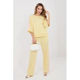 Dámský dresový set skládající se z mikiny a kalhot, ideální pro každodenní stylování v casual stylu. Hladký vzor činí set univerzálním a snadno kombinovatelným s různými příležitostmi, od procházek přes nákupy až po domácí relax. Set je vyroben z příjemné směsi polyesteru, viskózy a elastanu. Materiál typu "máslo" je mimořádně měkký, jemný a velmi příjemný na dotek, což zaručuje vysoký komfort nošení a volnost pohybu. Kalhoty mají vysoký pas a dlouhé, přímé nohavice, které se dobře přizpůsobují postavě. V pasu mají praktické stahování pro lepší přizpůsobení postavě. Model je také vybaven pohodlnými bočními kapsami. Mikina s loketními rukávy skvěle doplňuje celý set. Jako další dekorativní prvek jsou moderní pruhy po celé délce rukávů a nohavic, které dodávají setu sportovní a moderní charakter.