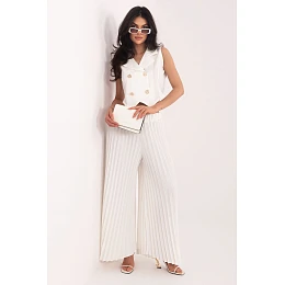 Dámský set skládající se z vesty a kalhot je elegantní a všestranná volba, která se hodí jak do každodenních stylizací, do práce, tak i na formální události nebo večírky. Kombinace klasického střihu s moderním fasonem vytváří pohodlný a stylový set. Kalhoty s dlouhými, širokými nohavicemi jsou vyrobeny z kombinace polyesteru, viskózy a elastanu, což zajišťuje pohodlí, lehkost a jemnou pružnost. Plisé po celé délce a gumový pás zaručují pohodlné přizpůsobení se postavě a volnost pohybu. Dvojřadá vesta bez rukávů je zakončena límečkem a zapíná se na knoflíky, a jemné plisování na zádech jí dodává eleganci a originální charakter. Hladký vzor celého setu mu dodává univerzálnost a nadčasový styl. Jedná se o ideální set pro ženy, které ocení eleganci, pohodlí a moderní design, který se hodí do mnoha situací od práce, přes společenská setkání, až po formální události.