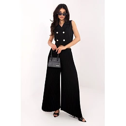 Dámský set skládající se z vesty a kalhot je elegantní a všestranná volba, která se hodí jak do každodenních stylizací, do práce, tak i na společenské události nebo večírky. Kombinace klasického střihu s moderním střihem vytváří pohodlný a stylový set. Kalhoty s dlouhými, širokými nohavicemi jsou vyrobeny z kombinace polyesteru, viskózy a elastanu, co zaručuje pohodlí, lehkost a jemnou elasticitu. Plisování po celé délce a gumový pásek v pasu zaručují pohodlné přizpůsobení postavě a volnost pohybu. Dvojitá vesta bez rukávů je dokončena límečkem a zapíná se na knoflíky, a jemné plisování na zádech jí dodává eleganci a originální charakter. Hladký vzor celého setu mu dodává všestrannost a nadčasový styl. Jedná se o ideální set pro ženy, které ocení eleganci, pohodlí a moderní design, který se hodí do mnoha situací od práce, přes společenská setkání až po formální události.