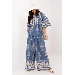 Dámský set v boho stylu je lehký a stylový návrh ideální na každý den. Volný střih a módní potisk dodávají celku výjimečný, umělecký charakter, který skvěle zapadá do volných, ženských stylizací. Set se skládá z topu a kalhot vyrobených z kombinace viskózy a polyamidu, co zajišťuje prodyšnost, lehkost a pohodlí nošení. Top s 3/4 rukávem má kulatý výstřih s vázáním, které dodává jemnou eleganci a umožňuje jemné nastavení. Kalhoty s dlouhými nohavicemi byly navrženy s ohledem na pohodlí, mají vázání v pasu, které umožňuje ideální přizpůsobení postavě. Volný střih zajišťuje volnost pohybu a celek tvoří harmonický, stylový set na každý den. Je to skvělá volba pro ženy, které ocení pohodlí, přírodní materiály a neokázalý boho styl.