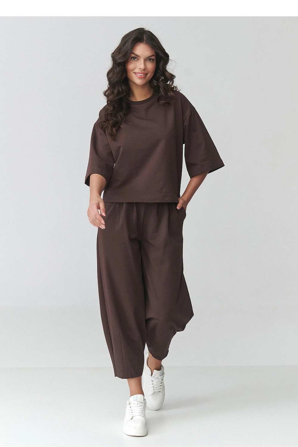 Elegantní dámský set s teplákovou soupravou je ideální nabídkou pro ženy, které ocení pohodlí a stylový vzhled ve svých každodenních outfitech. Sada se skládá z volného oversized trička s krátkým rukávem a pohodlných kalhot s elastickým pasem a kapsami, které zajistí volnost pohybu a perfektní přizpůsobení postavě. Tento módní casual set se hodí jak na procházky, nákupy, tak i na neformální setkání. Moderní střih zdůrazňuje ženskou siluetu a zároveň zaručuje maximální pohodlí při nošení po celý den. Je to skvělá volba pro ženy, které hledají spojení stylu a funkčnosti. Díky univerzálnímu střihu se dámská tepláková souprava skvěle hodí ke teniskám, vytvářející moderní a pohodlný outfit na každou příležitost. Je to must-have v šatníku každé ženy, která ocení prémiové dámské oblečení, pohodlí a nadčasový design.