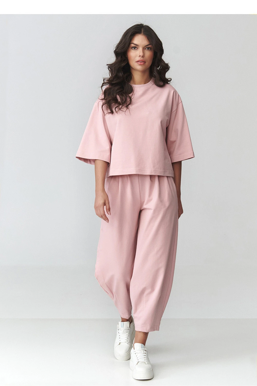 Elegantní dámský teplý set je ideální nabídkou pro ženy, které ocení pohodlí a stylový vzhled v každodenních outfitcích. Sestava se skládá z volného oversized trička s krátkým rukávem a pohodlných kalhot s elastickým pasem a kapsami, které zajišťují volnost pohybu a dokonalé přizpůsobení postavě. Tento stylový casual set se hodí jak na procházky, nákupy, tak i na volnější setkání. Moderní střih zdůrazní ženskou siluetu a zároveň zaručí maximální pohodlí po celý den. Je to skvělá volba pro ženy, které hledají spojení stylu a funkčnosti. Díky univerzálnímu střihu se dámský set skvěle kombinuje se sportovními botami, vytvářející trendy a pohodlný outfit na každou příležitost. Je to must-have v šatníku každé ženy, která oceňuje premium ženské oblečení, pohodlí a nadčasový design.