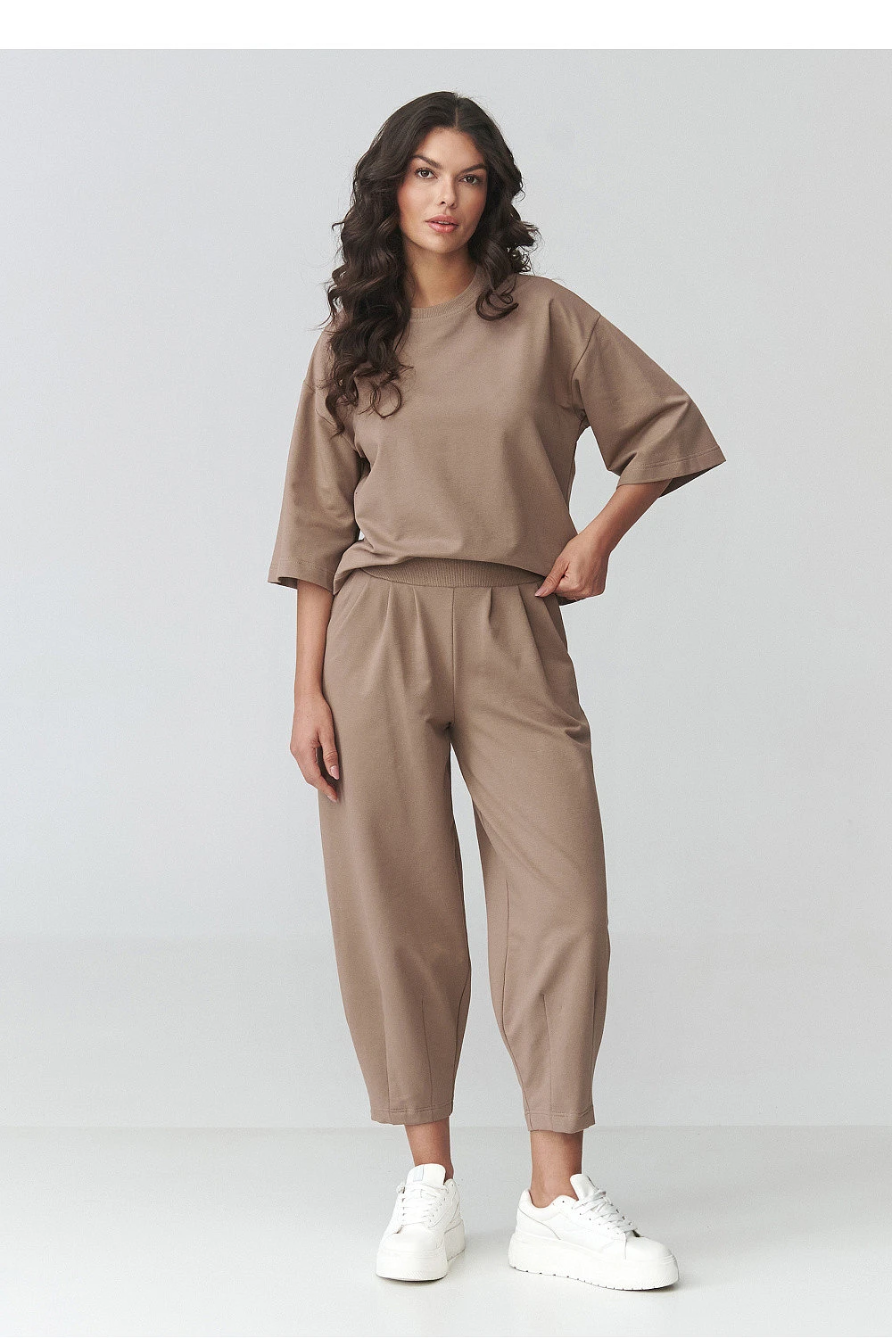 Stylový dámský teplý set je ideální volbou pro ženy, které ocení pohodlí a módní vzhled v každodenním oblékání. Sada se skládá z volného oversized trička s krátkým rukávem a pohodlných kalhot s elastickým pasem a kapsami, které zajistí volnost pohybu a dokonalé přizpůsobení postavě. Tento módní casual set se osvědčí jak při procházce, nákupech, tak i při neformálních setkáních. Moderní střih zdůrazňuje ženskou siluetu a zároveň zaručuje maximální pohodlí po celý den. Je to skvělá volba pro ženy, které hledají spojení stylu a funkčnosti. Díky univerzálnímu střihu se dámský teplý set skvěle kombinuje se sportovními botami, vytvářející módní a pohodlnou stylizaci na každou příležitost. Je to must-have v šatníku každé ženy, která ocení prémiovou dámskou módu, pohodlí a nadčasový design.