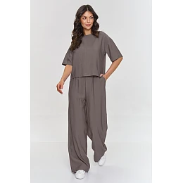 Tento elegantní set je ideální volbou na jarní a letní dny, kdy chcete spojit módní vzhled s vysokou kvalitou provedení. Sada obsahuje volnou blůzu ve tvaru boxu, která skvěle ladí s elegantními stylizacemi. Krátký rukáv a jednoduchý střih blůzy dělají z tohoto kusu skvělou volbu pro formální i méně formální příležitosti, spojující eleganci s pohodlím. Kalhoty se vyznačují širokými nohavicemi, které dodávají stylizaci moderní a elegantní vzhled. Elastický pas zajišťuje pohodlné nošení a jejich délka přidává celku eleganci a stylu. Model je vyroben z jemného a lehkého materiálu imitujícího len. Jednoduchý, ale vysoce rafinovaný střih dává setu nadčasový charakter, který bude vypadat stylově na jakémkoli typu postavy. Sada se skvěle hodí na obchodní schůzky, elegantní události nebo výlety do města, kdy si přejete spojení elegance a volnosti. Můžete ji doplnit podpatky, elegantními sandály nebo bílými teniskami.