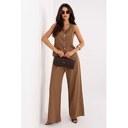 Kompletní dámský set skládající se z vesty a kalhot je elegantní a zároveň pohodlná nabídka ideální na každý den i do práce. Udržovaný v hladkém stylu vypadá moderně a nadčasově, umožňuje vytváření mnoha stylových outfitů. Vesta klasického střihu s kulatým výstřihem je zapínána na knoflíky v jednořadém uspořádání, co jí dodává uklizený, elegantní charakter. Skvěle se hodí jak samostatně, tak i v kombinaci s košilí nebo topem. Kalhoty s dlouhými, širokými nohavicemi zajistí pohodlí a volnost pohybu, zároveň se zařazují do aktuálních trendů. Vsazený gumový pas zaručuje pohodlné přizpůsobení siluetě, a boční kapsy zvyšují funkčnost modelu. Vyrobený z přírodní směsi bavlny a lnu je kompletní set prodyšný, lehký a příjemný na nošení, díky čemuž se skvěle hodí na teplejší dny. Je to stylová a praktická nabídka pro ženy, které si cení elegance v každodenním provedení.