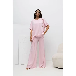 Dámský set skládající se z blůzy a kalhot je ideální volbou pro ženy, které oceňují pohodlí a elegantní, zároveň volný styl. Skvěle se hodí jak na každodenní nošení, tak i do pracovních stylizací, poskytující pohodlí po celý den. Model je vyroben z velmi příjemného materiálu typu "máslo", který díky kombinaci viskózy a elastanu je měkký, jemný a elastický. Tkanina se krásně skládá na postavě, zajišťující pohodlí nošení a volnost pohybů. Blůza s krátkým rukávem a klasickým, kulatým výstřihem se vyznačuje decentními detaily, ozdobnými knoflíčky umístěnými na levé straně a šňůrkou dole vpravo, což dodává celku originální charakter a umožňuje lehké přizpůsobení postavě. Kalhoty s dlouhými, širokými nohavicemi vypadají moderně a elegantně, zároveň poskytují maximální pohodlí. Hladký vzor setu z něj činí mimořádně univerzální a snadno kombinovatelný. Je to skvělá volba pro ženy, které hledají spojení stylu, pohodlí a funkčnosti v každodenním šatníku.