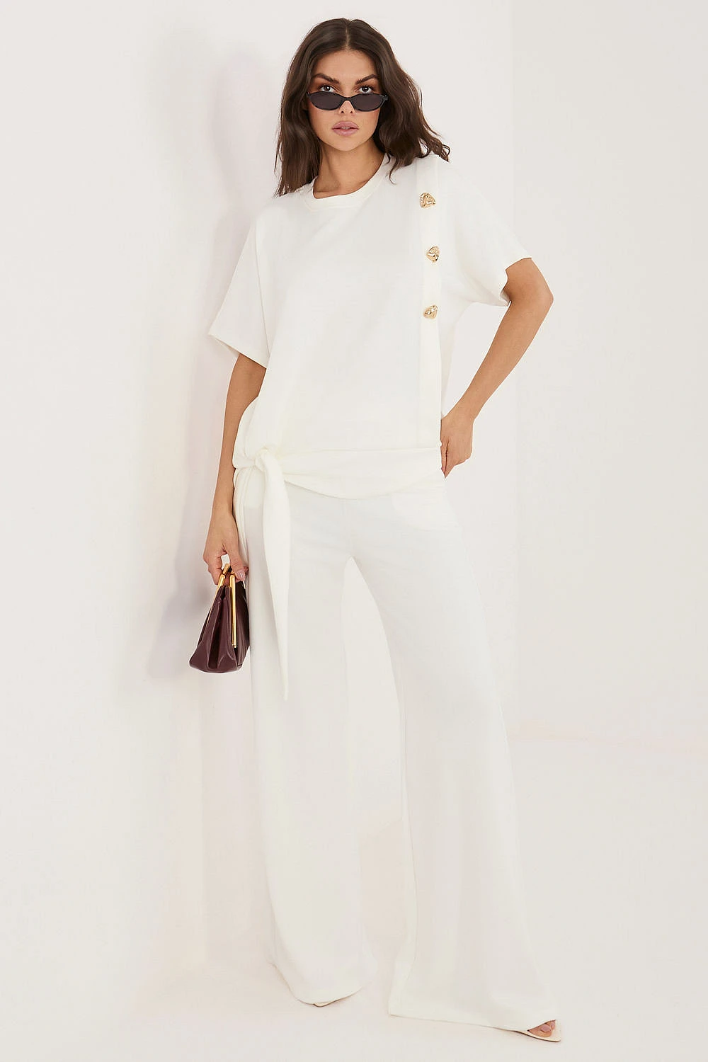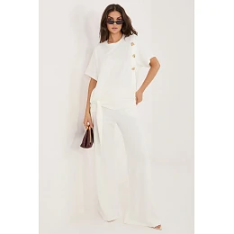 Dámský set skládající se z blůzy a kalhot je ideální volbou pro ženy, které ocení pohodlí a elegantní, zároveň volný styl. Skvěle se hodí jak na každý den, tak do pracovního stylu, zajistí pohodlí po celý den. Model je vyroben z velmi příjemného materiálu typu "máslo", který díky kombinaci viskózy a elastanu je měkký, jemný a elastický. Tkanina se krásně přizpůsobí postavě, zaručuje pohodlí nošení a volnost pohybů. Blůza s krátkým rukávem a klasickým, kulatým výstřihem se vyznačuje decentními detaily, ozdobnými knoflíky umístěnými na levé straně a vázáním dole napravo, které dodává celku originální charakter a umožňuje lehké přizpůsobení postavě. Kalhoty s dlouhými, širokými nohavicemi vypadají moderně a elegantně, zároveň zajišťují maximální pohodlí. Hladký vzor setu z něj činí mimořádně univerzální a snadno stylizovatelný. Jedná se o skvělou volbu pro ženy, které hledají spojení stylu, pohodlí a funkčnosti ve svém každodenním šatníku.