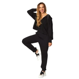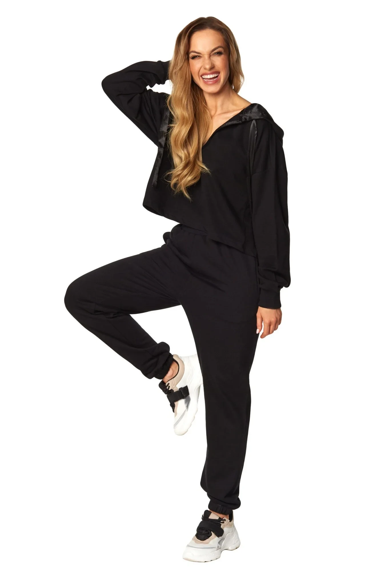 Skvělý dvoudílný komplet z vysoce kvalitní bavlny, který se rychle stane vaším oblíbeným kouskem v šatníku. Měkký a vysoce pohodlný, propracovaný v každém detailu a neuvěřitelně ženský. Horní díl je top s dlouhými rukávy a kapucí podšitý krásným stříbrným saténem. Výstřih do V svůdně odhalí vaše půvaby. Dlouhé kalhoty s bočními kapsami, nohavice zakončené gumičkou. Klasická černá barva. Složení: 100% kvalitní bavlna.