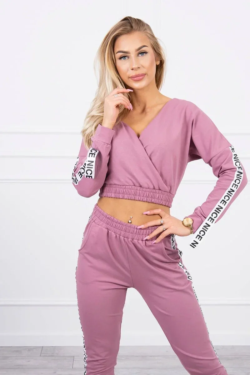 Představujeme vám sadu mikiny a kalhot. Mikina a kalhoty mají ozdobnou stuhu s nápisem. Ve spodní části mikiny je všitá guma. Kalhoty s kapsami. Velmi módní a stylová sada. Sada je vyrobena z vysoce kvalitního materiálu. Velikost je univerzální a vyhovuje dámám velikosti S, M nebo L.