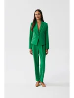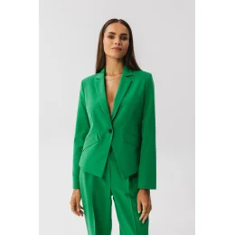Tato bunda je kombinací elegance a modernosti. Je vyrobena z vysoce kvalitní tkaniny a vypadá výjimečně. Má krátký a asymetrický střih, který mu dodává originalitu. Klasický límec dodává eleganci a styl. Zapínání na jeden knoflík je praktické a dodává saku na eleganci. Dlouhé rukávy jsou univerzální a umožňují různé stylizace. Na přední straně jsou imitace kapes s klopami, které dodávají charakter. Sako je plně podšité pro pohodlné nošení a povrchovou úpravu. Je ideální volbou pro různé příležitosti, od formálních schůzek až po neformálnější situace, a dodá vám sebevědomí a eleganci. Navrženo a ušito v Polsku.