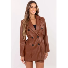 Elegantní dámský sakko z ekokože je jedinečným prvkem šatníku, který kombinuje klasiku s moderním charakterem. Vyrobený z odolné směsi polyesteru a polyuretanu vypadá neuvěřitelně elegantně a zároveň je praktický a snadno udržovatelný. Díky podšívce poskytuje pohodlí při nošení v chladnějších dnech, což z něj činí ideální volbu na podzim, zimu a jaro. Sakko s standardní délkou se vyznačuje širokými límci, které mu dodávají nadčasový šarm, a vestavěnými ramenními polštářky, které zdůrazňují postavu a dodávají mu strukturu. Dvojitý řadový zapínání na knoflíky posiluje elegantní charakter tohoto modelu, a ozdobné záhyby v pasu opticky zjemňují postavu, dodávají sakku ženský výraz. Jedná se o skvělou volbu na různé příležitosti, od každodenních stylizací po společenská setkání či pracovní dny. Sakko skvěle ladí jak s elegantními kalhotami, tak s džínsy, umožňujíc vytváření různorodých, stylových outfitů.