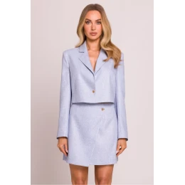 Elegantní krátký sako s nadčasovým střihem, vyrobený z vysoce kvalitní látky. Klasický límec dodává eleganci a ozdobný srdcovitý knoflík přidává jemný, výjimečný dotek. Model je kompletně podšitý, co zajišťuje pohodlí nošení a perfektní padnutí na postavu. Skvěle se hodí jak k elegantním, tak k casual stylizacím. Navržen a ušit v Polsku s pečlivostí o každý detail.