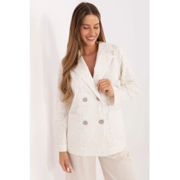 Elegantní dámský sako v klasickém střihu je skvělou volbou na každý den, do práce a také na formální události. Vyrobený z vysoce kvalitní bavlny, poskytuje pohodlí a prodyšnost. Dominantní průsvitný vyšívaný vzor dodává tomuto kousku jedinečný charakter a ženskou jemnost. Sako má standardní délku, dlouhý rukáv a klasické zapínání na knoflíky. Vložené kapsy přidávají praktičnost a podšívka zajišťuje estetické dokončení a lepší padnutí na postavu. Model bez kapuce, ideální pro elegantní styly.