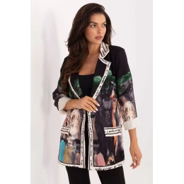 Dámský každodenní sako, ideální do práce a casual stylizace. Vyrobeno z viskózy a polyesteru s potiskem a decentními nápisy po celém materiálu, vyniká moderním, originálním designem. Standardní délka modelu s dlouhými rukávy, s vestavěnými polštářky na ramenou a podšívkou zajistí elegantní střih a pohodlí nošení. Zapínání na knoflík zdůrazňuje klasický střih, hladká podšívka přidává lehkost a pohodlí.