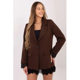 Elegantní dámský sako je univerzálním prvkem šatníku, který se skvěle hodí jak do každodenního nošení do práce, tak na slavnostní či společenské události. Klasický střih s standardní délkou zdůrazňuje postavu a dodává outfitu eleganci. Model je vybavený skládanými límečky a vestavěnými polstrováními na ramenou, které sako dodávají výrazné formy a opticky modelují linii ramen. Jednoduché zapínání na knoflík zdůrazňuje elegantní charakter celku a hladký vzor dělá sako nadčasovým a snadno kombinovatelným kouskem. Výjimečným akcentem jsou krajkové detaily, jak na spodním lemu saka, tak na dlouhých rukávech, které celku dodávají ženskou lehkost a subtilní eleganci. Vyrobené z kombinace polyesteru a elastanu zajišťuje pohodlí nošení a dobrou výšivku. Podšívka zvyšuje pohodlí a zajišťuje, že sako se skvěle tvaruje na postavě. Ideální volba pro ženy, které hledají elegantní sako s jemným, dekorativním akcentem, které se hodí na mnoho různých příležitostí.