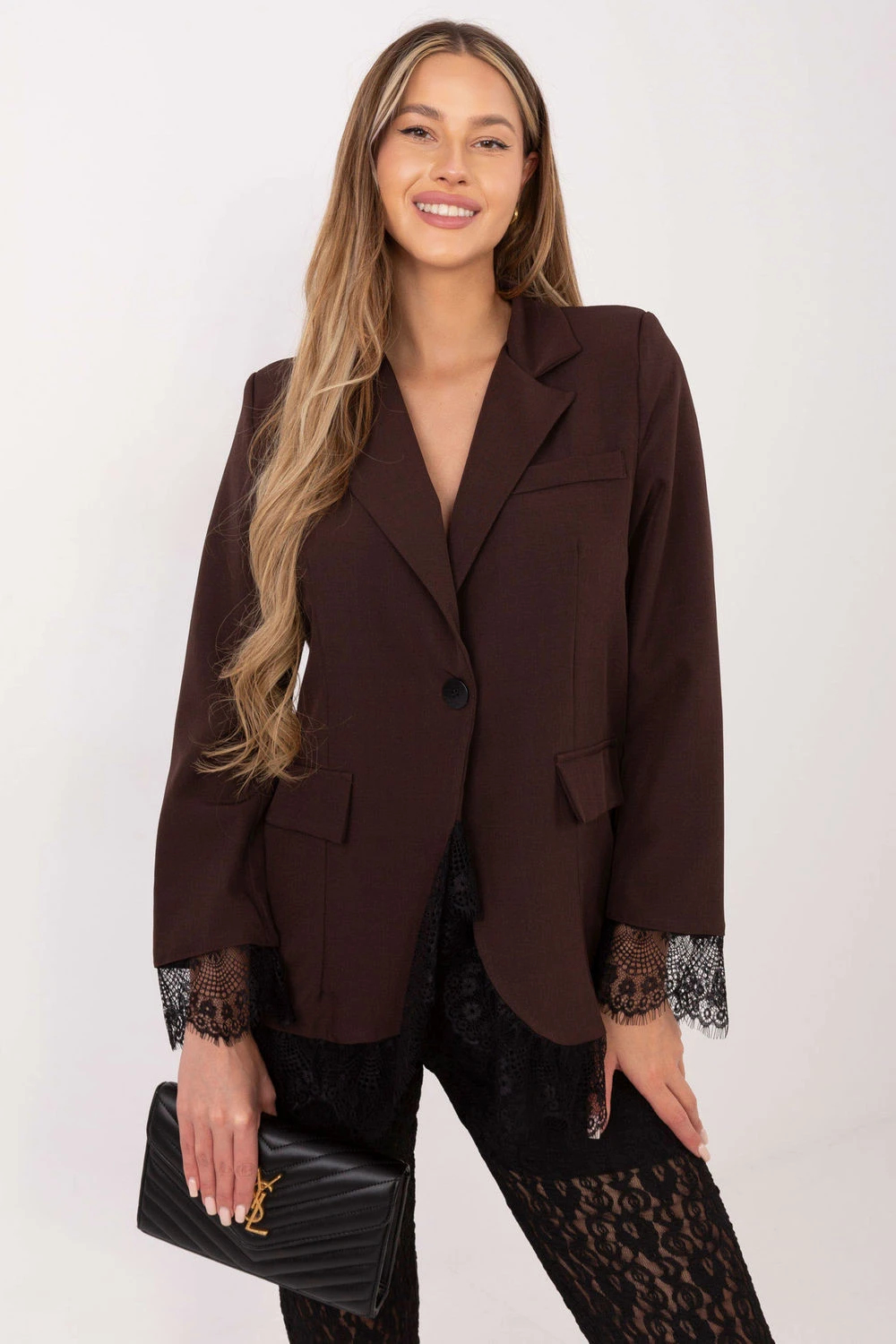 Elegantní dámský sako v nadčasovém, klasickém stylu, ideální na slavnostní události, do práce i na večírek. Hladký střih zdůrazňuje jeho univerzální charakter a jemné detaily dodávají celku výjimečnou eleganci. Model je vyroben z vysoce kvalitního polyesteru s přídavkem elastanu, co zajišťuje trvanlivost, pružnost a pohodlí nošení. Standardní délka a dlouhý rukáv zdobený jemnou krajkou se krásně kombinuje s krajkovým lemem dole na saku, dodávající mu ženský a stylový vzhled. Sako má jednořadé zapínání na knoflík a podšívku, která zvyšuje pohodlí nošení a dělá celkový vzhled dokonalým. Je to skvělá volba pro ženy, které chtějí spojit klasickou eleganci s jemnou dávkou romantiky.