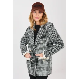 Sako z tvídu elegantního a klasického střihu, vyrobené z vysoce kvalitní bavlny, ideální na podzim, zimu a jaro. Standardní délka, dlouhé rukávy a dvouradé zapínání na knoflíky. Obrácené límce, manžety a vložené kapsy zdobené jemnými perličkami, které sako dodávají eleganci a ženský charakter. Sako má podšívku, hladký kostičkovaný vzor a není vyztužené, takže je vhodné jak na každodenní, tak na společenské stylizace, do práce a na elegantní události.