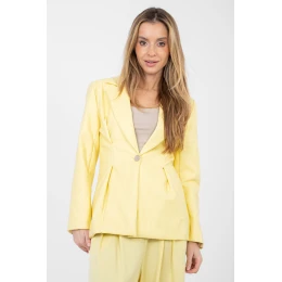 Elegantní dámský blejzr vyrobený z vysoce kvalitní ekokože na bázi viskózy a polyuretanu, vytvořený s ohledem na výstavní styling. Hladký materiál zdůrazňuje moderní a nadčasový charakter modelu, standardní délka zajišťuje klasické proporce. Blejzr má skládané klopy a efektní kontrafaldy na přední straně, které dodávají siluetě výraz a elegantní formu. Zapíná se na knoflík, je vybaven podšívkou, což zaručuje pohodlí nošení a estetické přizpůsobení. Vložené polštářky na ramenou jemně modelují linii ramen, přidávají celku eleganci a profesionální vzhled. Je to ideální volba pro formální a výstavní sestavy, jak s kalhotami, tak s sukní nebo šaty.