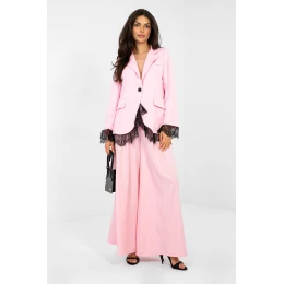 Elegantní dámský sako s nadčasovým, klasickým stylem, ideální na formální události, do práce i na večírek. Hladký střih zdůrazňuje jeho univerzální charakter a jemné detaily dodávají celku výjimečnou eleganci. Model je vyroben z vysoce kvalitního polyesteru s přídavkem elastanu, co zaručuje trvanlivost, pružnost a pohodlí nošení. Standardní délka a dlouhý rukáv s jemnou krajkou krásně ladí s krajkovým zakončením spodní části saka, dodávajíce mu ženský a stylový vzhled. Sako má jednořadé zapínání na knoflík a podšívku, která zvyšuje pohodlí nošení a zajišťuje, že se celý kousek skvěle drží na postavě. Je to skvělá volba pro ženy, které chtějí spojit klasickou eleganci s jemnou nádechem romantiky.