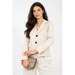 Elegantní dámský sakko ve stylu casual, ideální na každý den i do práce. Klasický střih v moderním provedení zaručuje, že model skvěle doplní jak kancelářské, tak méně formální outfit. Vyrobený z vysoce kvalitní směsi polyesteru, viskózy a elastanu, zaručuje pohodlí nošení, odolnost a jemnou pružnost. Hladký vzor zdůrazňuje univerzální charakter sakka a usnadňuje jeho stylování. Model s krátkou délkou, dlouhým rukávem a zapínáním na knoflíky v jednom řadě krásně podtrhuje siluetu a dodává celkově lehkost. Je to skvělá volba pro ženy, které ocení pohodlí, klasiku a casual eleganci v každodenním provedení.