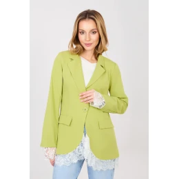 Elegantní dámský sako standardní délky navržené pro ženy, které si cení nadčasového stylu a univerzálnosti. Model s hladkým zpracováním se skvěle hodí jak do pracovních stylizací, tak na schůzky nebo každodenní nošení. Sako má vestavěné ramenní polštářky, které jemně zdůrazňují linii siluety a dodávají jí výrazný elegantní charakter. Klopové límce dodávají třídu a jednořadé zapínání na knoflík zajišťuje pohodlí a estetické přizpůsobení. Imitace kapes pod patkami zdůrazňují formální styl modelu, zachovávajíce přitom jeho lehkost. Dlouhý rukáv a spodní lem saka byly pečlivě opatřeny jemnou krajkou, která přidává ženský a originální akcent. Model má podšívku, co zvyšuje pohodlí nošení a zajišťuje, že sako se perfektně přizpůsobuje postavě. Vyrobený z vysoce kvalitní směsi polyesteru s přídavkem elastanu, zaručuje trvanlivost, pružnost a volnost pohybů. Ideální volba pro ženy, které hledají elegantní a zároveň univerzální sako na různé příležitosti.