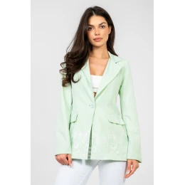 Elegantní dámský sako standardní délky, navržené pro ženy, které oceňují nadčasový styl a všestrannost. Model s hladkým dokončením se skvěle hodí jak do pracovního stylu, na schůzky, tak i na večírek nebo každodenní nošení. Sako má vestavěné polštářky na ramenou, které jemně zdůrazňují linii postavy a dodávají jí výrazný, elegantní charakter. Obrácené límce přidávají eleganci, a jednořadé zapínání na knoflík zajišťuje pohodlí a estetické přizpůsobení. Imitace kapes pod patkami zdůrazňují formální styl modelu, zachovávajíce přitom jeho lehkost. Dlouhý rukáv a dolní lem saka jsou pečlivě lemovány jemnou krajkou, která přináší ženský a originální akcent. Model má podšívku, co zvyšuje pohodlí nošení a zajišťuje, že sako se skvěle tvaruje na postavě. Vyrobena z vysoce kvalitní směsi polyesteru s přídavkem elastanu, zaručuje trvanlivost, pružnost a volnost pohybů. Ideální volba pro ženy, které hledají elegantní a zároveň všestranné sako na mnoho příležitostí.