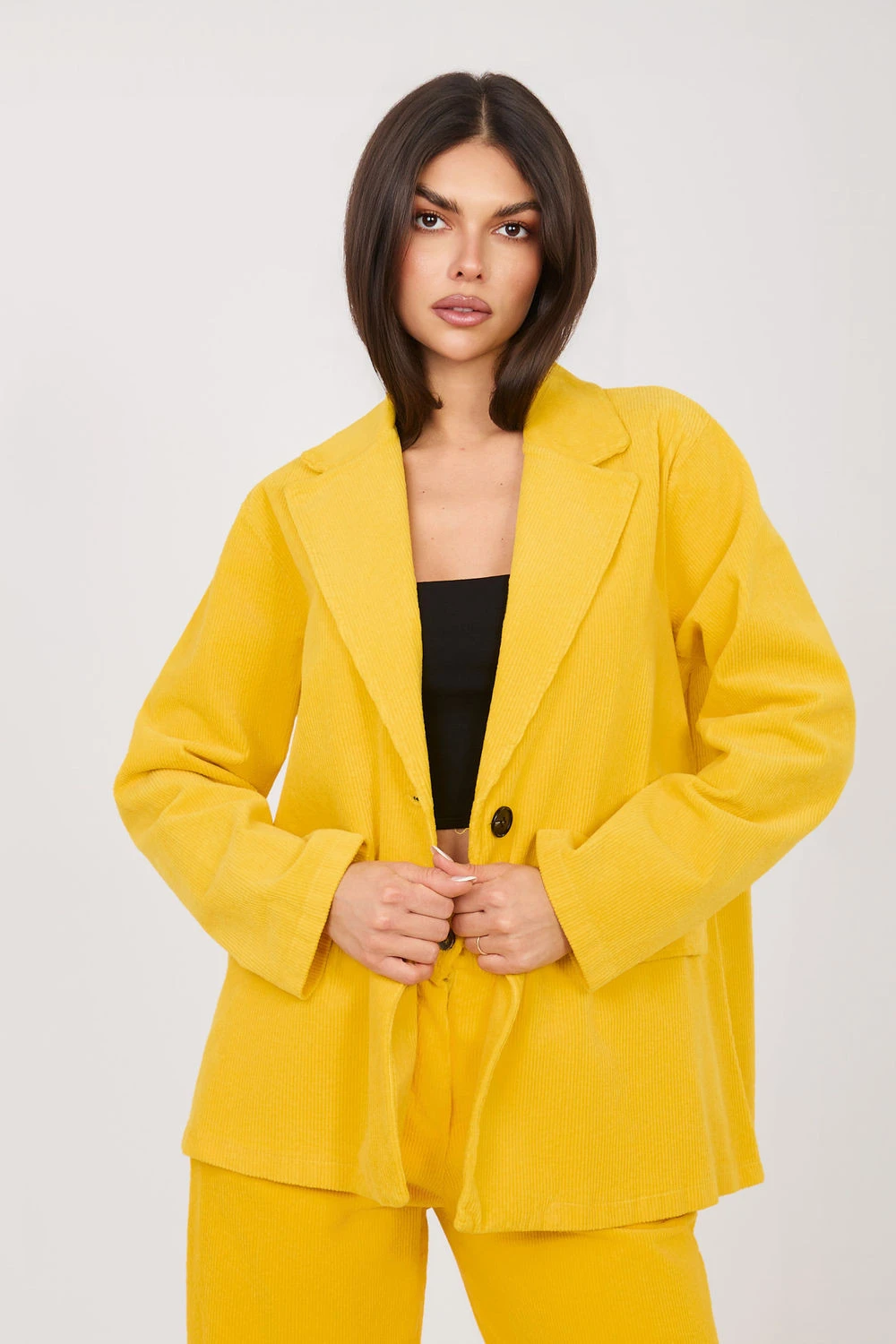 Elegantní ženský nátělník ze štruksu v casualovém provedení, který se skvěle hodí jak do každodenního života, tak do práce. Jedná se o model spojující volnost s elegancí, díky čemuž ho snadno zkombinujete s mnoha stylizacemi, od klasických látkových kalhot po džíny nebo tužkovou sukni. Vyrobený z vysoké kvality bavlny s přídavkem elastanu, poskytuje pohodlí nošení a jemnou elasticitu, co se promítá do celodenního komfortu. Hladký vzor zdůrazňuje jeho univerzální charakter, zatímco štruksová struktura přidává subtilní texturu a módní akcent. Model má dlouhý rukáv a klasické límce, které dávají nátělníku nadčasový styl. Standardní délka dobře padne na siluetě a jednořadé zapínání na knoflík zdůrazňuje elegantní střih. Imitace kapes jsou estetickým završením, zachovávajícím minimalistický charakter designu. Jedná se o ideální nabídku pro ženy, které ocení pohodlí, styl a funkčnost ve svých každodenních a pracovních stylizacích.