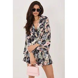Elegantní dámské sako s výjimečným květinovým potiskem, které skvěle kombinuje klasiku s moderním stylem. Ideální pro různé příležitosti, hodí se jak do práce, na obchodní schůzky, tak na večírky, dodává stylizaci ženského charakteru. Střih krásně podtrhuje siluetu, a jednocestné zapínání na dva knoflíky dodává celku nadčasovou eleganci. Široké rukávy o délce 3/4 vnášejí lehkost a decentní módní akcent. Model je vyroben z vysoce kvalitní směsi polyesteru a elastanu, což zajišťuje pohodlí při nošení a dobré přizpůsobení siluetě. Sako má podšívku, což zvyšuje komfort nošení a způsobuje, že se skvěle přizpůsobuje tělu.