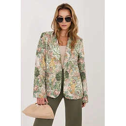 Elegantní dámský sako standardní délky navržené s ohledem na styl a pohodlí. Model se vyznačuje efektním květinovým potiskem, který dodává celku ženský a trendy charakter. Vyrobeno z vysoce kvalitní směsi polyesteru s přídavkem elastanu, díky čemuž je materiál lehce elastický a pohodlný na nošení. Sako má dlouhý rukáv a klasické límce, které zdůrazňují jeho nadčasový střih. Zapíná se na jednořadé knoflíky, co mu dodává elegantní a upravený vzhled. Další výhodou je podšívka, která zvyšuje komfort nošení a estetiku dokončení. Vložené polštářky na ramenou jemně tvarují siluetu, dodávají jí výraznější linii. Ideální jak do kanceláře, tak do běžného nošení, skvěle ladí s elegantními kalhotami, sukní nebo džíny.